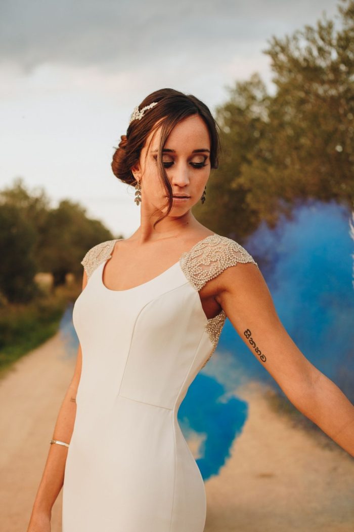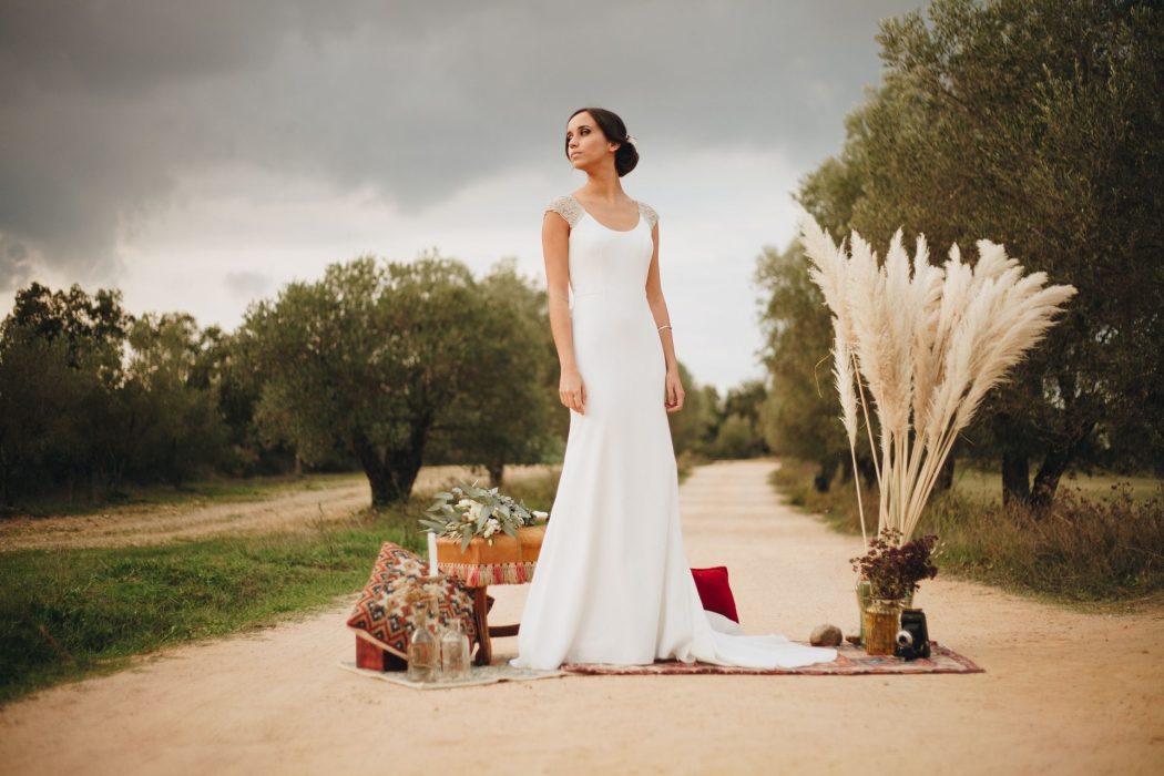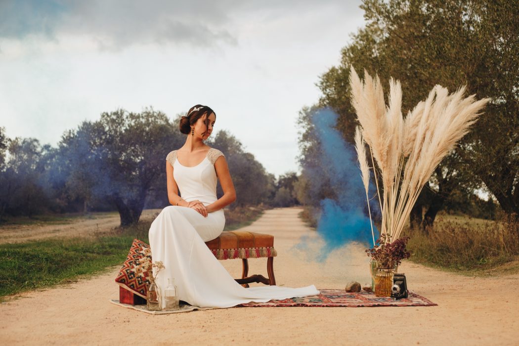 The session is focused on a rustic and rural environment of the Empordà where the green dominates in the photo and highlights the beauty of the dresses with the model, accompanied by props to round the rural scenery vintage.